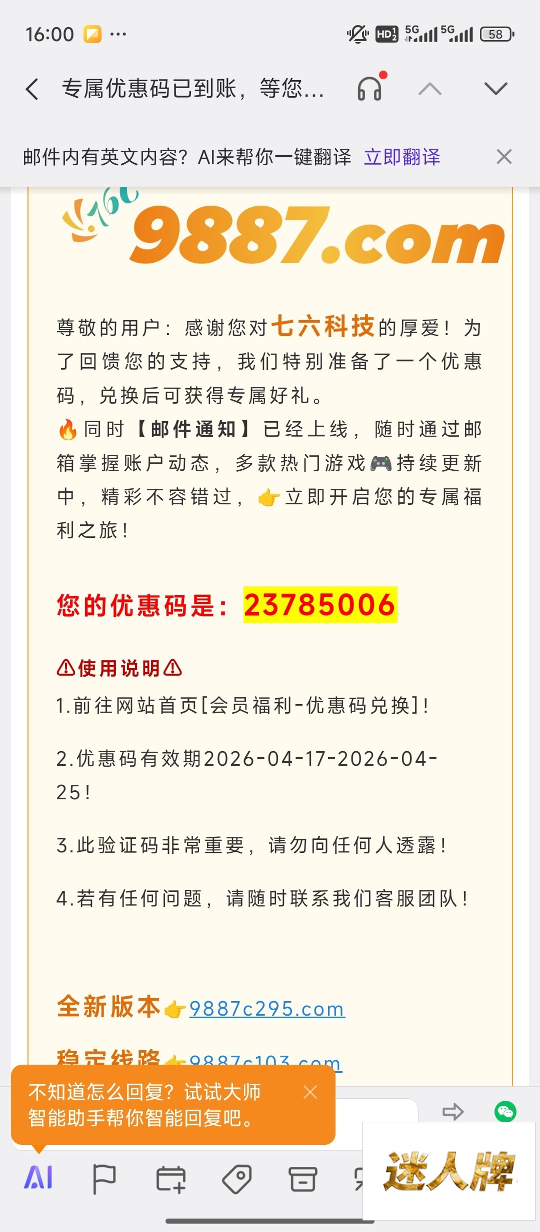 76c彩票刚刚又看到邮件彩金码,领了8还没开始玩,有的去链接9887.com