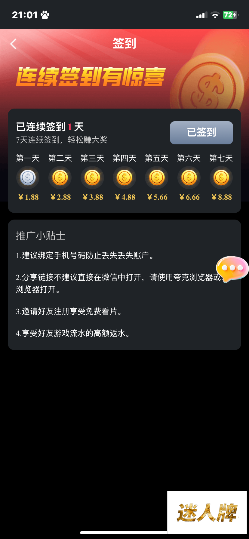 绑定手机号码得两块 签到得1.88可以免费签到一个星期有毅力的老哥可以存到第7天玩